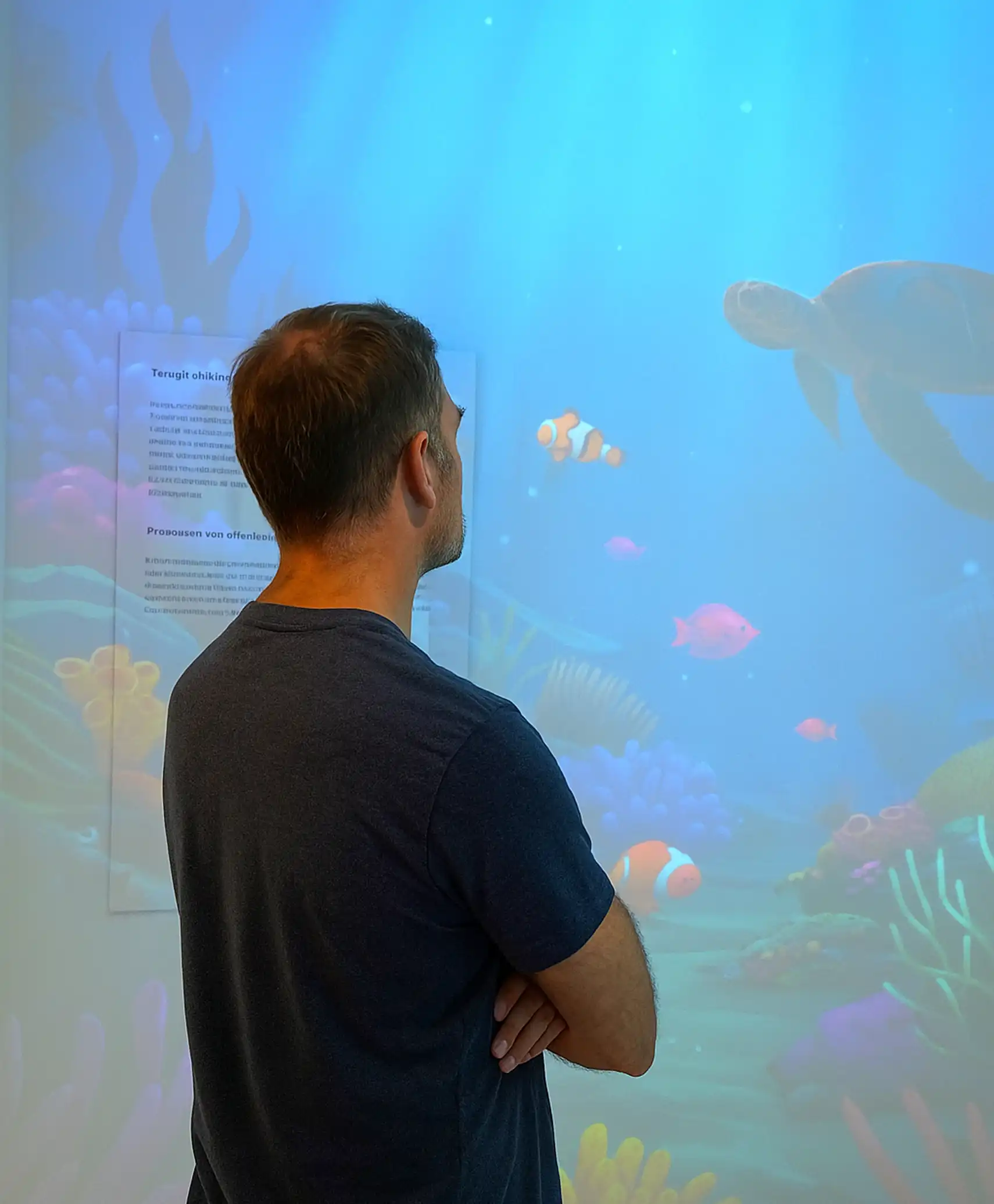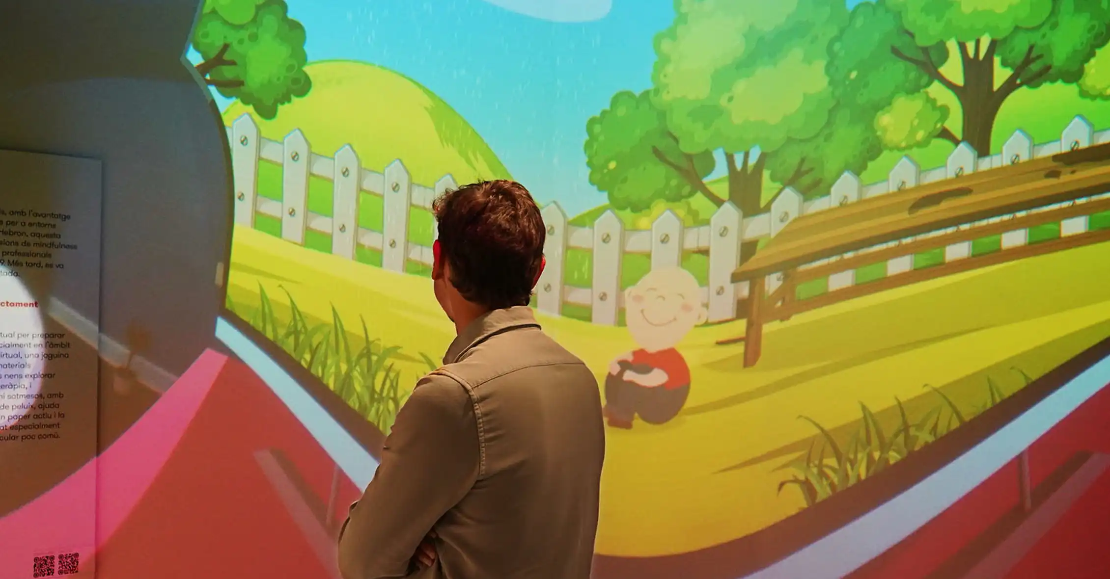 Among the exhibition’s various interactive installations, a highlight is an immersive room featuring Broomx technology, where visitors can experience some of the relaxation and therapeutic distraction sessions used in the Pediatric Oncology and Hematology Unit at Vall d’Hebron Hospital.